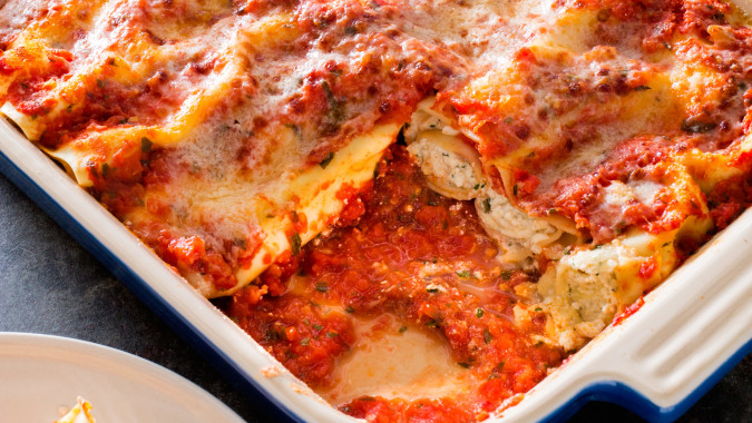 Manicotti are tubes of pasta stuffed with Italian cheeses and baked in a simple tomato sauce, similar to a meatless lasagna. Those who have made manicotti before and have been scarred by the experience may want to run in the opposite direction from this recipe. But fear not: thanks to no-boil lasagna noodles, we have a dramatically streamlined manicotti recipe that does away with precooking the pasta and the fussy task of stuffing each pasta tube with filling. Learning how to make stuffed manicotti with our recipe requires a fraction of the work of a traditional manicotti preparation yet tastes every bit as good.